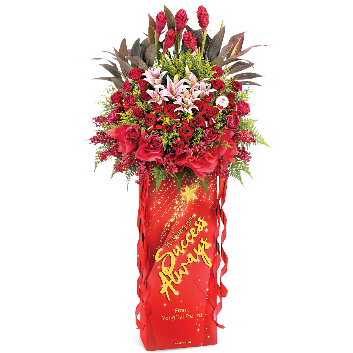• A stunning opening flower stand decked in a ravishing royal red, wishing your treasured recipient great success!