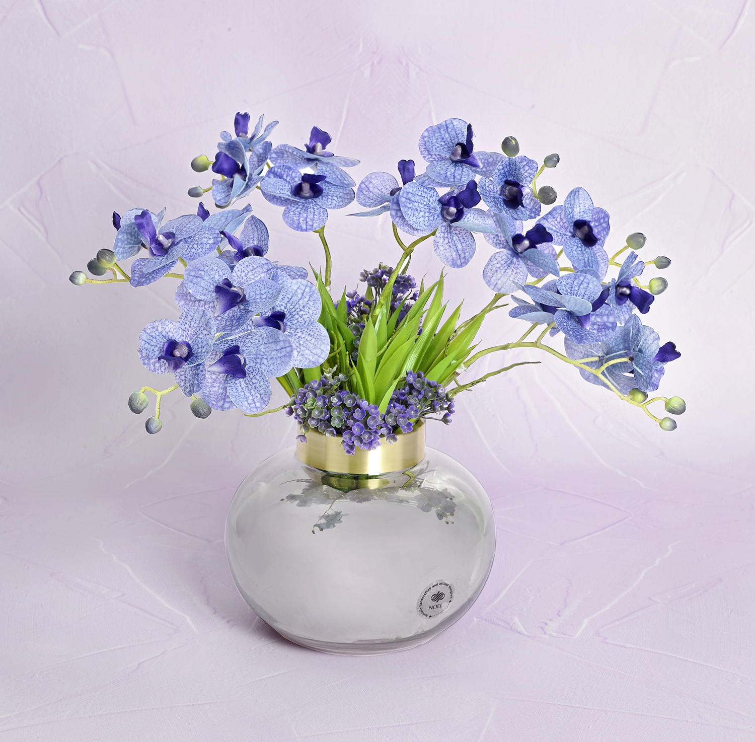 • Bask in the allure of this floral arrangement with flowers in a pleasing muted blue.