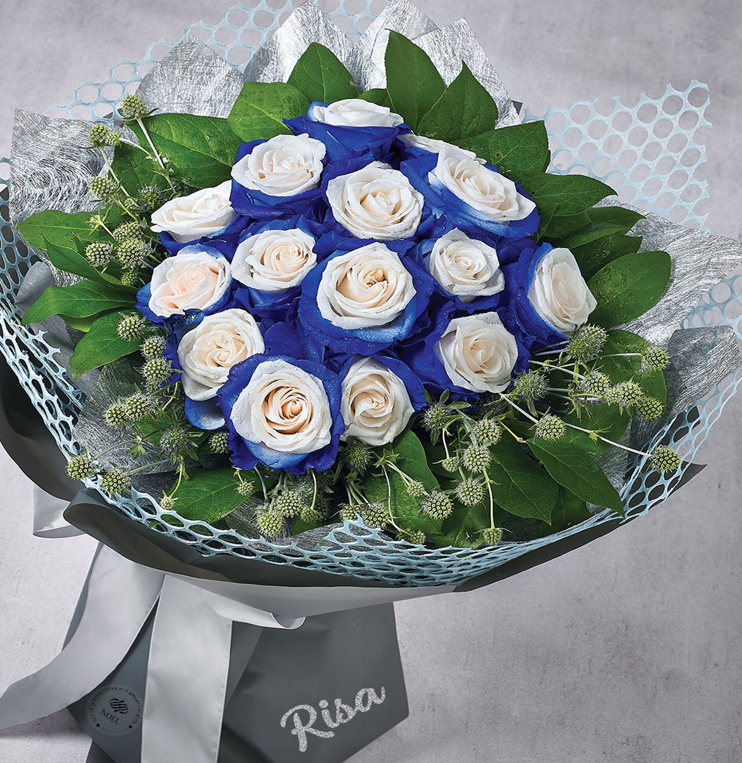 • Bouquet consists of 9 Stalks Blue Edge White Ecuadorian Roses, accompanied by Salal Tip and Eryngium.