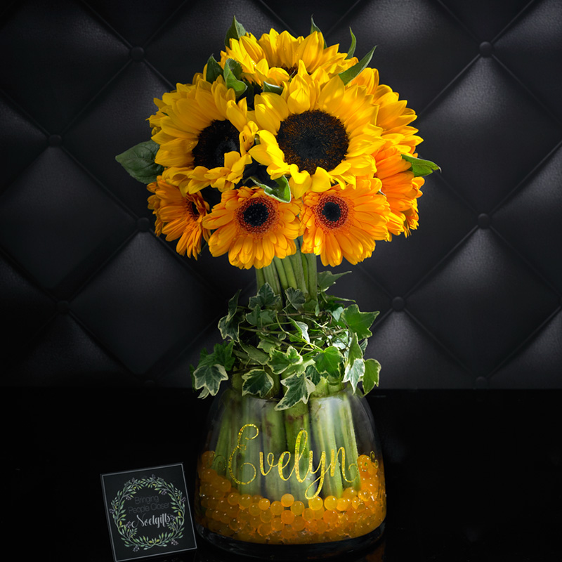 • Fresh flowers table arrangement consists of 8 Sunflower, 10 Gerbera accompanied by Ivy Leaf.