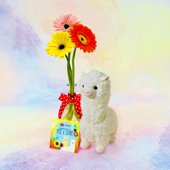 • The arrangement consists of White Alpaca plush (Height: 28cm), accompanied with floral arrangement in a clear glass vase.