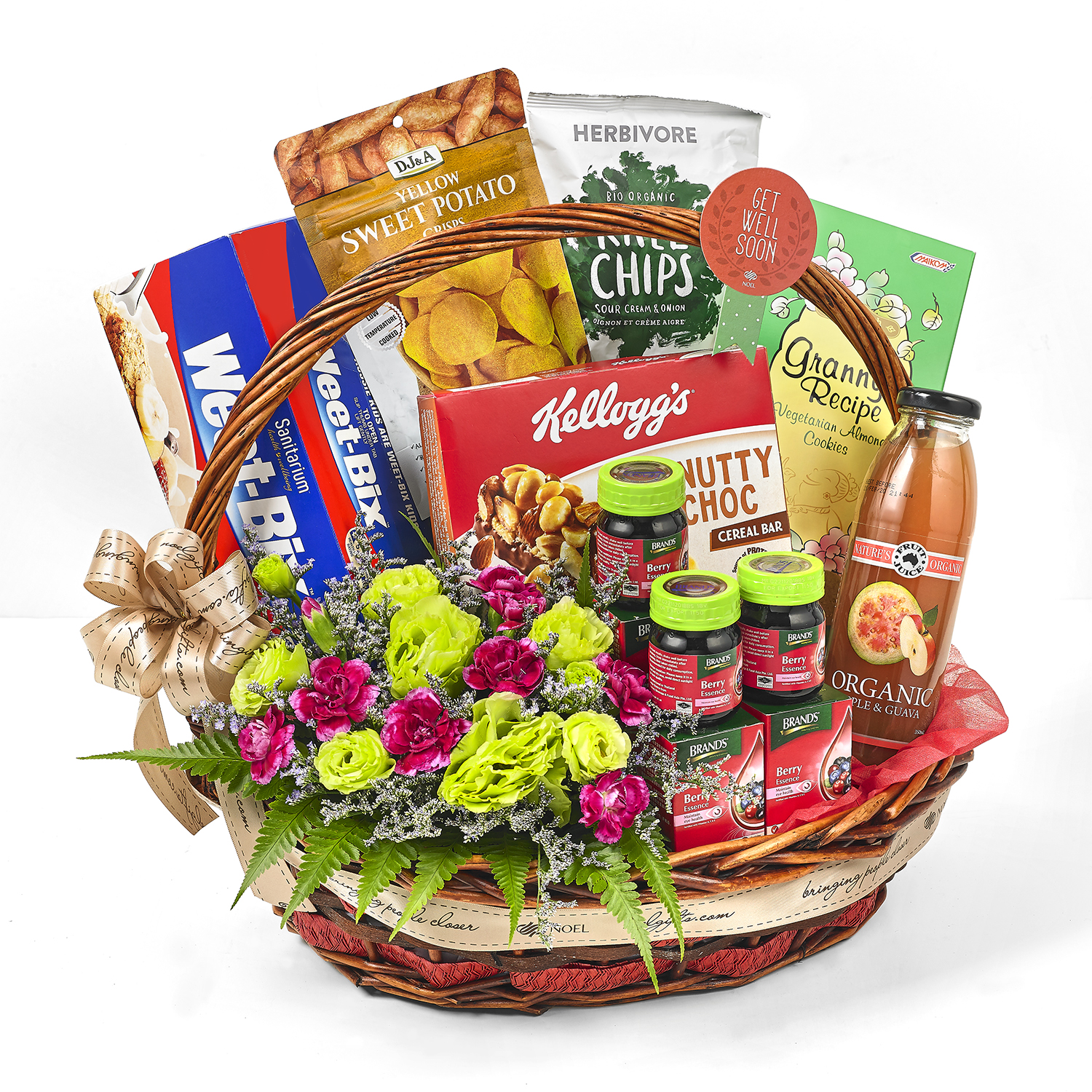 • Convey get well wishes and cheer your recipient on with a gift basket of nutritious delights, specially curated for the vegetarian in your life.