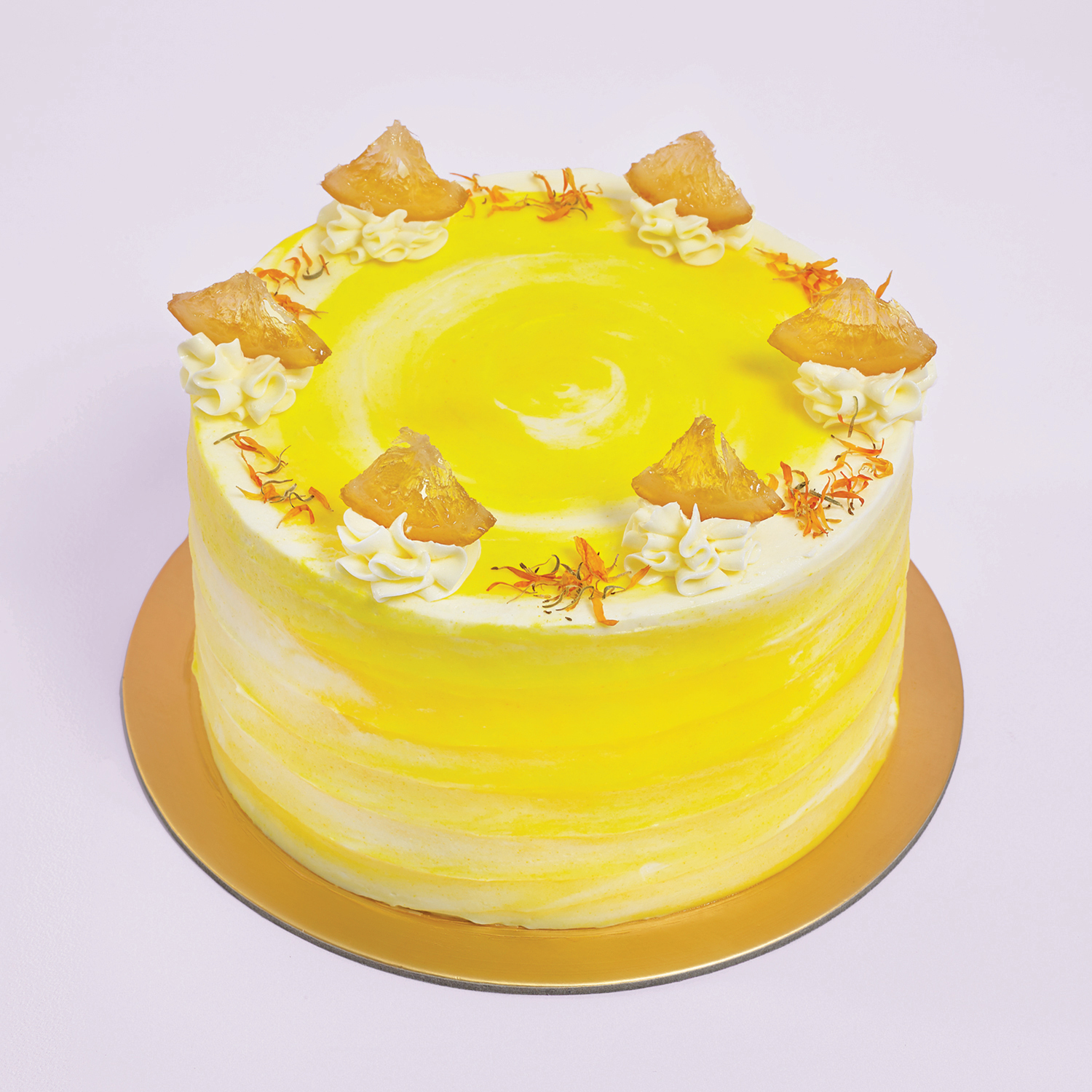 • Honey Lemon sponge and chamomile infused cream cake(1.2kg) topped with candied lemon slices and edible dried marigold petals, finished with marbled lemon buttercream.