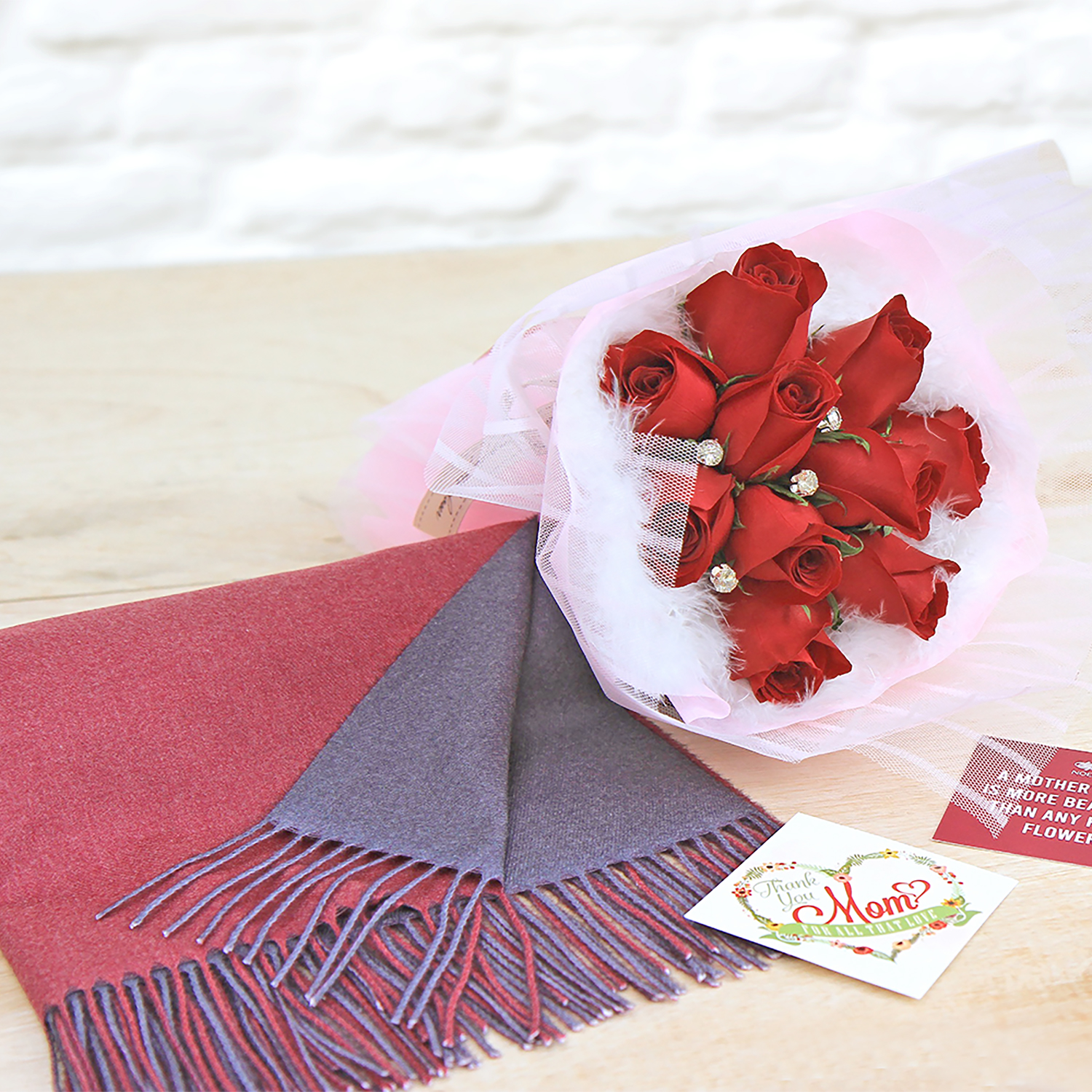 • A considerate gift to wrap the lady in warmth and a beautiful bouquet to complement her tender smile.