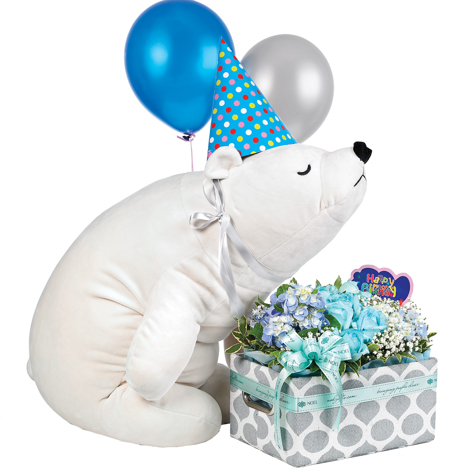 • Comes with balloons and floral arrangement.
