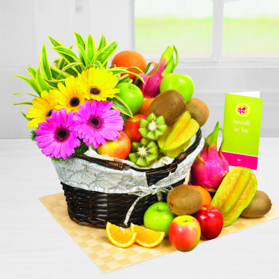 - Consists of Seasonal Fresh Fruits and Flowers.