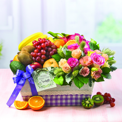 Consists of Seasonal Fresh Fruits and Flowers.