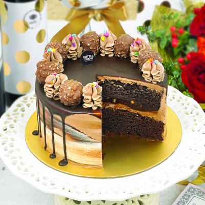 Indulge in layers of soft, chocolate sponge cake (800g) with hazelnut, nutella infused buttercream. Topped with a luxurious chocolate drip and Ferrero Rocher Chocolates with sprinkles.