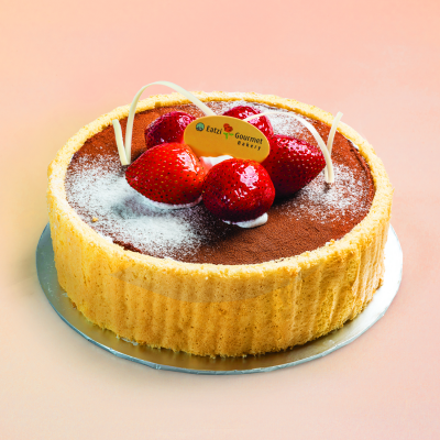 Light mascarpone cheese with delicate coffee-doused sponge layers topped with fresh strawberries for that finishing touch (500g).