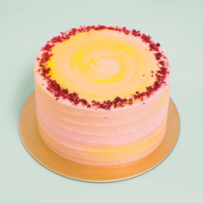 A unique combination of raspberry cream and passionfruit cream spread around soft lemon sponge cake (1kg), topped with freeze dried raspberry for a delectable crunch.