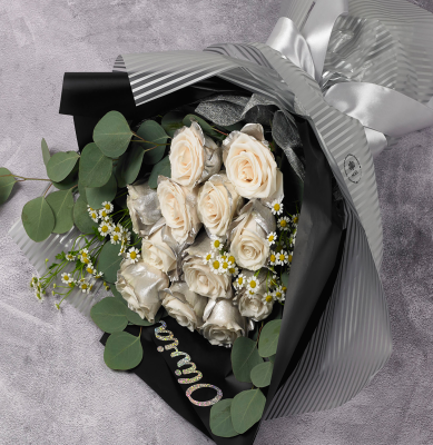 Bouquet consists of 12 Stalks Silver Edge White Ecuadorian Roses, accompanied by Chamomilla and Eucalyptus Populus.