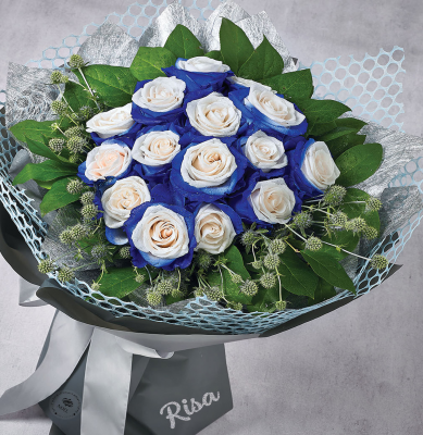 A huge bouquet of special roses with its edges tinged in vivid blue a floral gift full of surprise to amaze friends or precious loved ones!