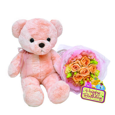 Celebrate with a gorgeous peach bear (Height: 35cm) adorned with a ribbon, and a pretty hand bouquet!