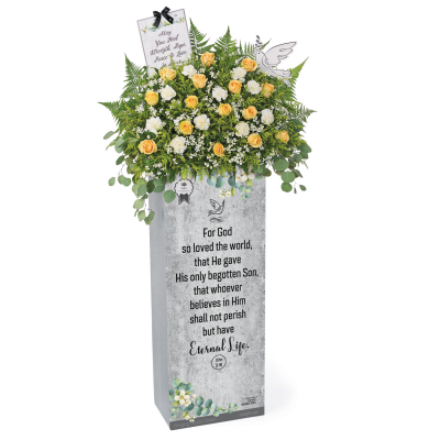 Condolence stand with fresh flowers.