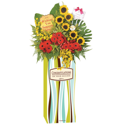 Congratulate your recipient on another milestone achieved with a gallant opening flower stand in a stylish, clean look.