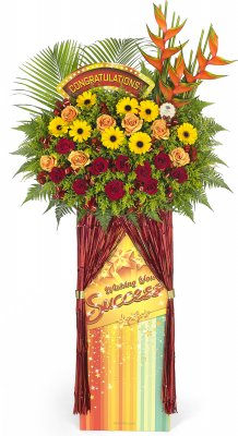 Send forth your sincere congratulations with a flower stand decked in victorious colours of red, yellow and saffron.