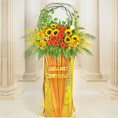 A splendid flower stand of warm gold, decorated with blooms of joyous yellow and striking vermillion orange for a sensational grand opening!