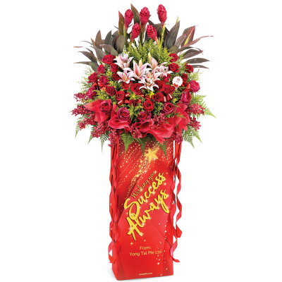 A stunning opening flower stand decked in a ravishing royal red, wishing your treasured recipient great success!